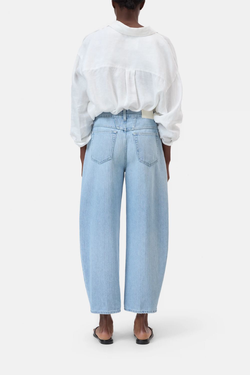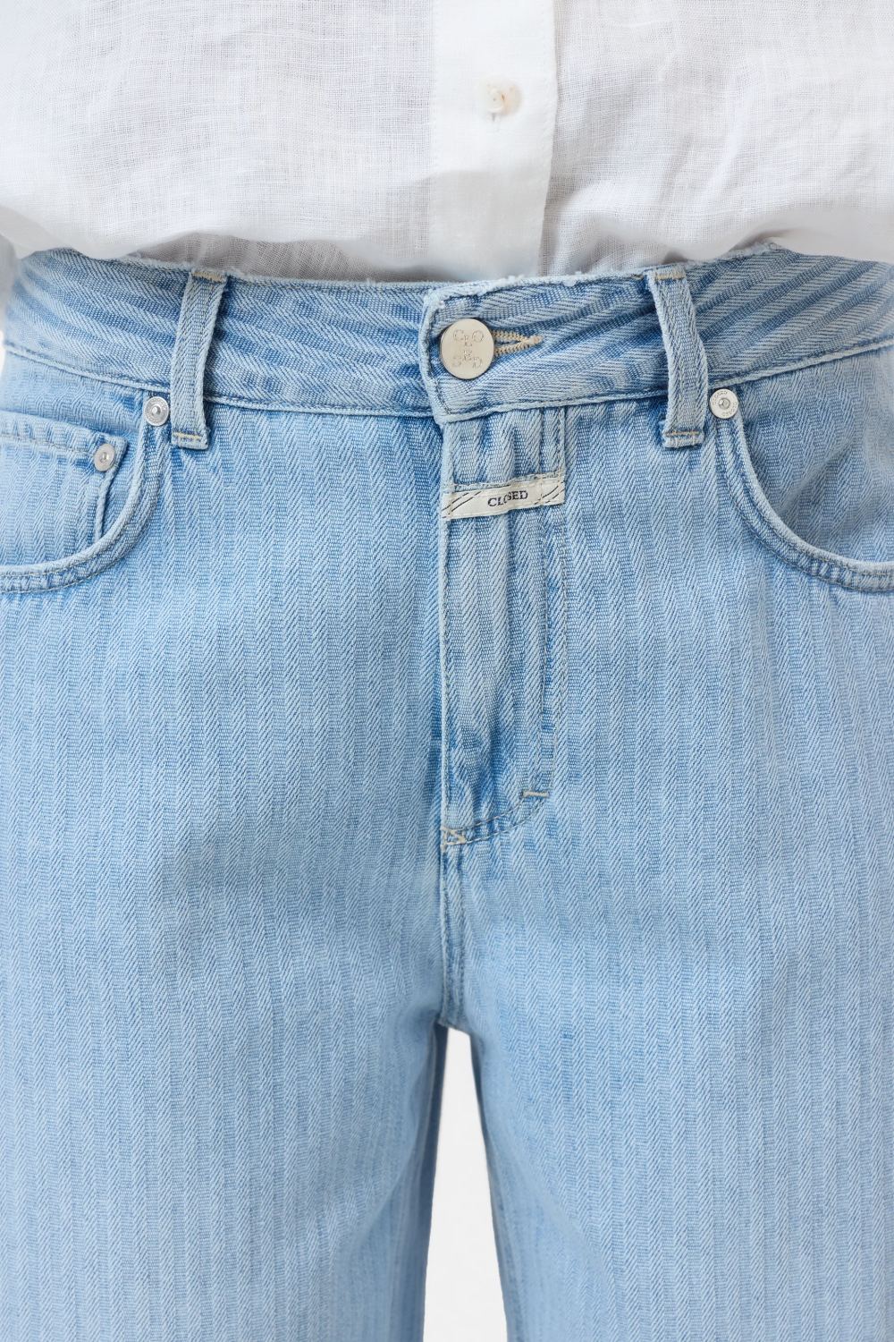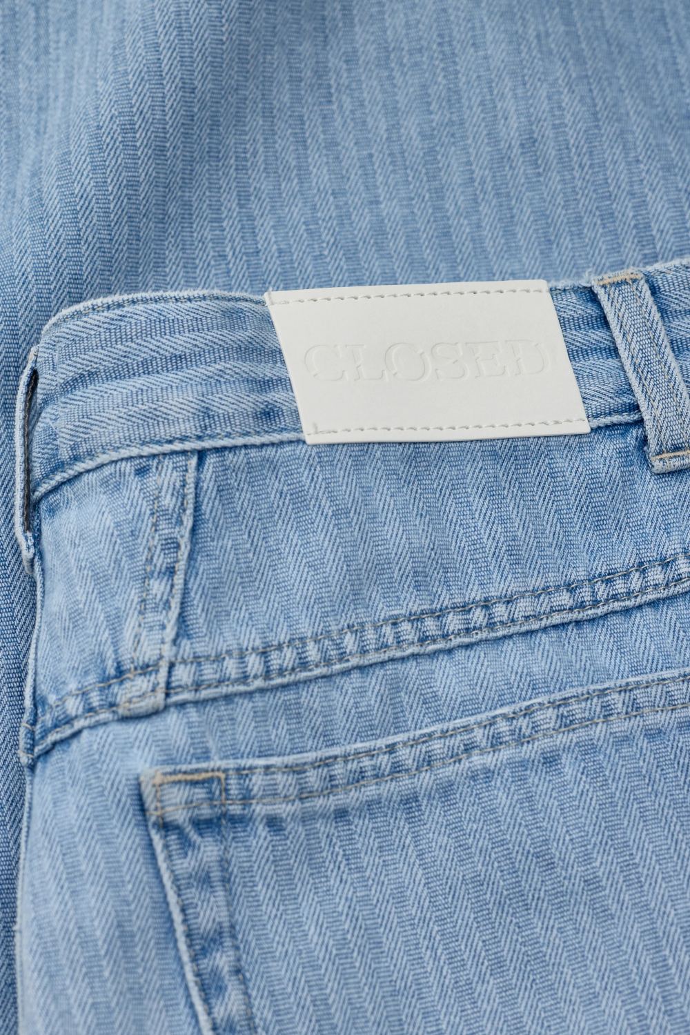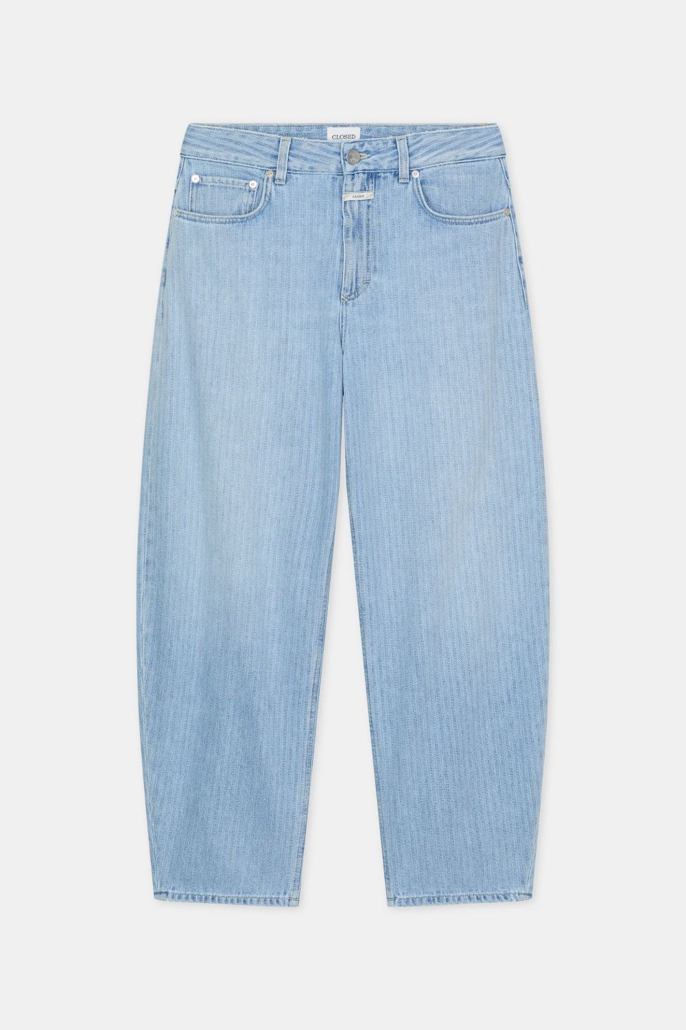 CLOSED kavbojke Jazzie so izdelane iz svetlo modrega denima italijanske izdelave. Značilen barrel kroj s srednje visokim pasom in krajšimi hlačnicami ustvarja sodobno silhueto, klasični detajli, kot so zanke za pas, petžepni dizajn ter zapiranje z gumbom in zadrgo, pa ohranjajo brezčasen videz.
