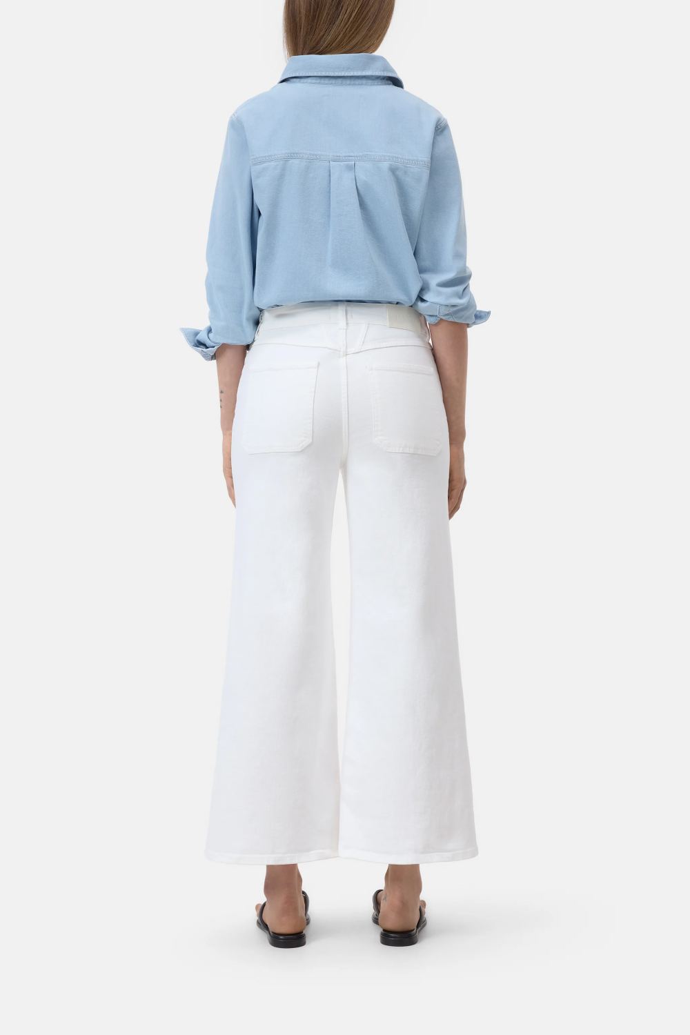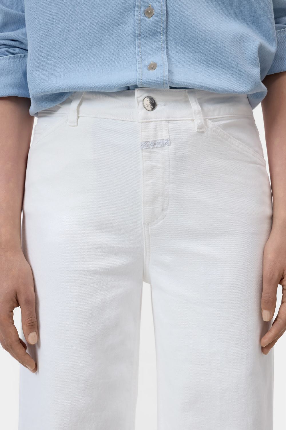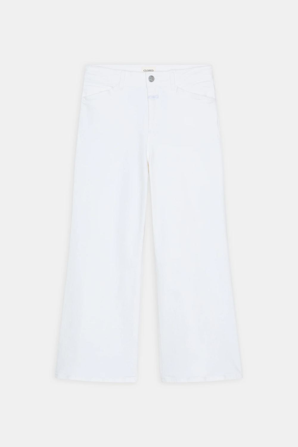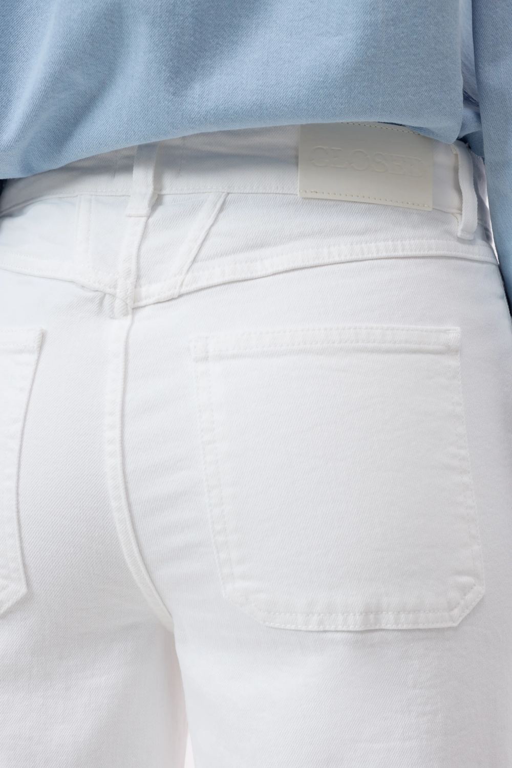 CLOSED kavbojke Wera so izdelane iz kakovostnega belega denima s klasično 3/1 keper vezavo, ki zagotavlja idealno težo in udobje za toplejši del leta. Širok kroj z visokim pasom, krajšimi hlačnicami in rahlo razširjenim zaključkom ustvarja sodoben videz. Posebnost modela so preoblikovani sprednji žepi, navdihnjeni z ikoničnim X-dizajnom. Izdelane so v Italiji iz okolju prijaznega BCI bombaža.
