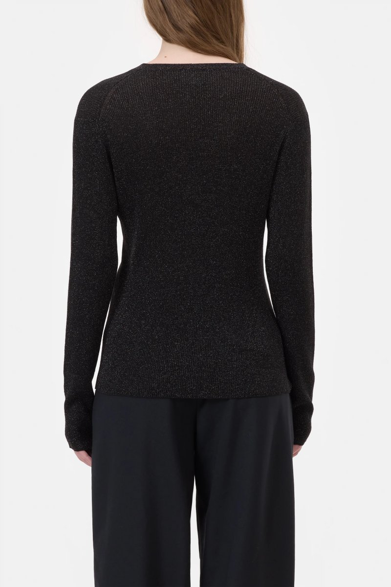 CLOSED oprijeta jopica, fino pletena iz mehke lureks preje z nežnimi bakrenimi in titanovimi kovinskimi vlakni, ima elegantno silhueto in prazničen pridih. Tkanina je izdelana v rebrastem pletenem vzorcu 2×2.