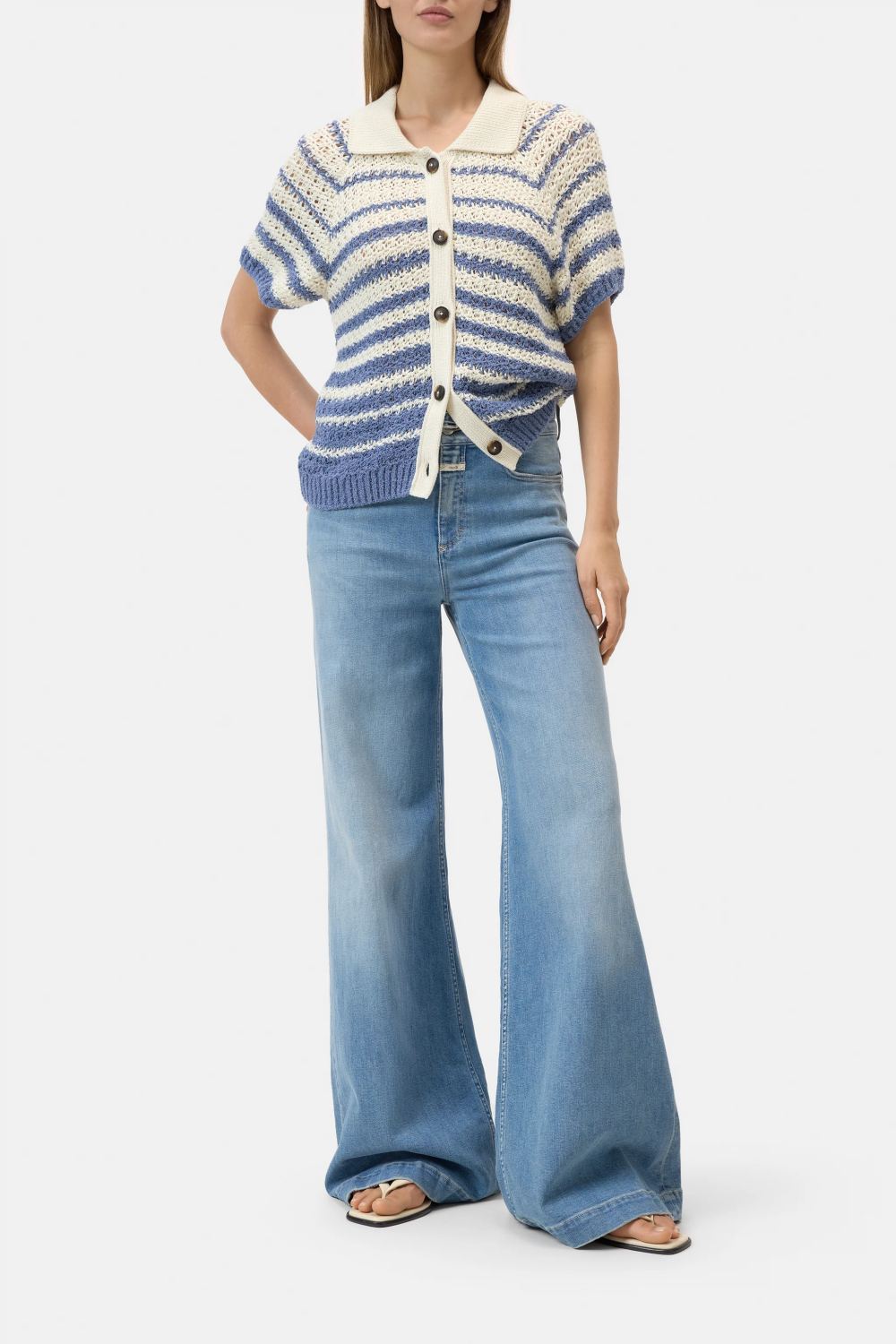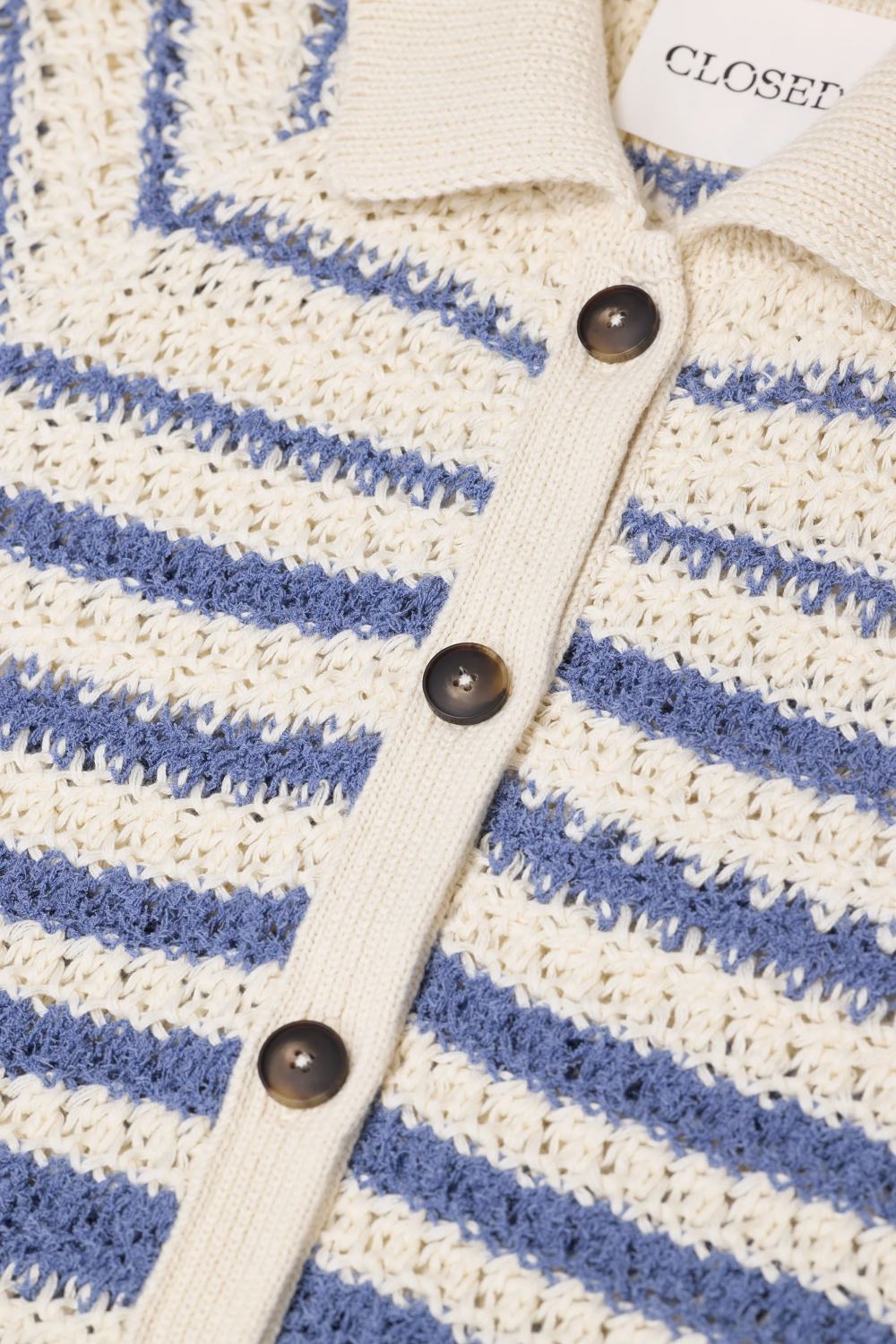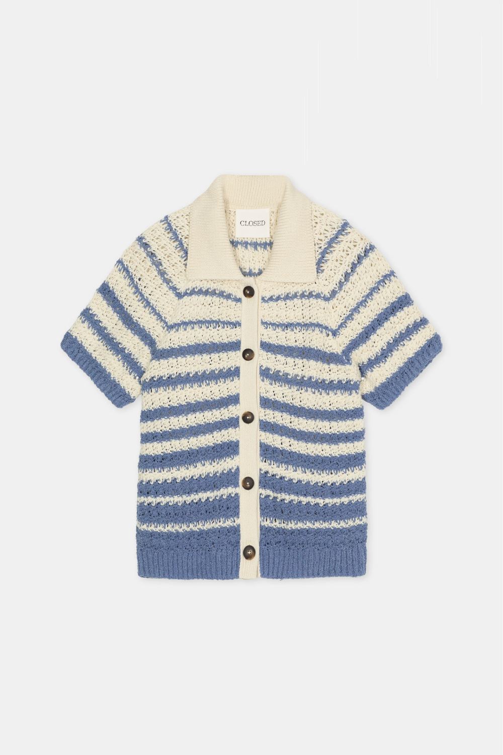 CLOSED črtasta jopica, pletena iz dveh kakovostnih niti iz organskega bombaža. Klasičen kroj in krajša dolžina ustvarjata rahlo oprijeto, a sproščeno silhueto. Poseben polo ovratnik in zapenjanje z gumbi dopolnjujeta sodoben videz.